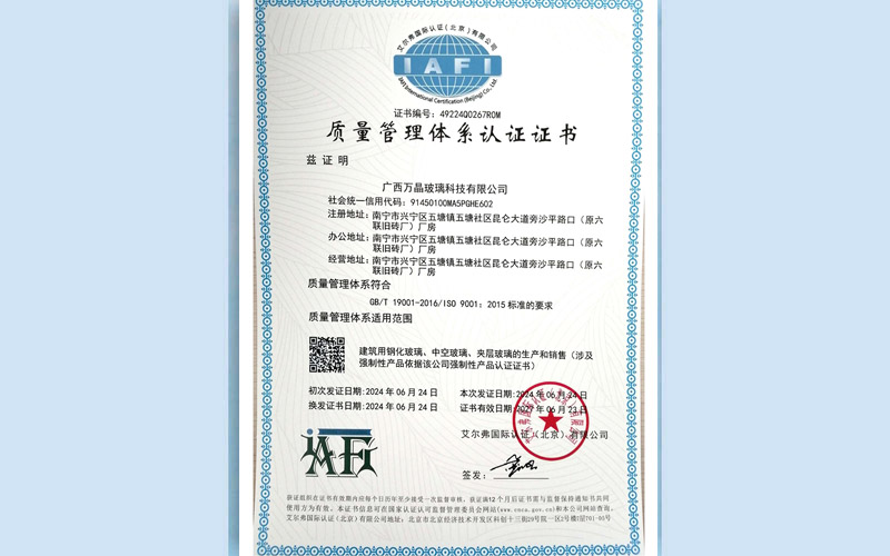 广西万晶玻璃科技有限公司成立于2020年5月18日,位于广西壮族自治区南宁市兴宁区,公司拥有全自动玻璃切割生产线、全自动高速双边磨生产线、强制对流双室连体钢化炉、智能型中空玻璃生产线、国内一流的夹层玻璃生产线等先进设备。主要从事钢化玻璃、中空玻璃、中空LOW-E玻璃、夹层玻璃、防火玻璃 等玻璃深加工。